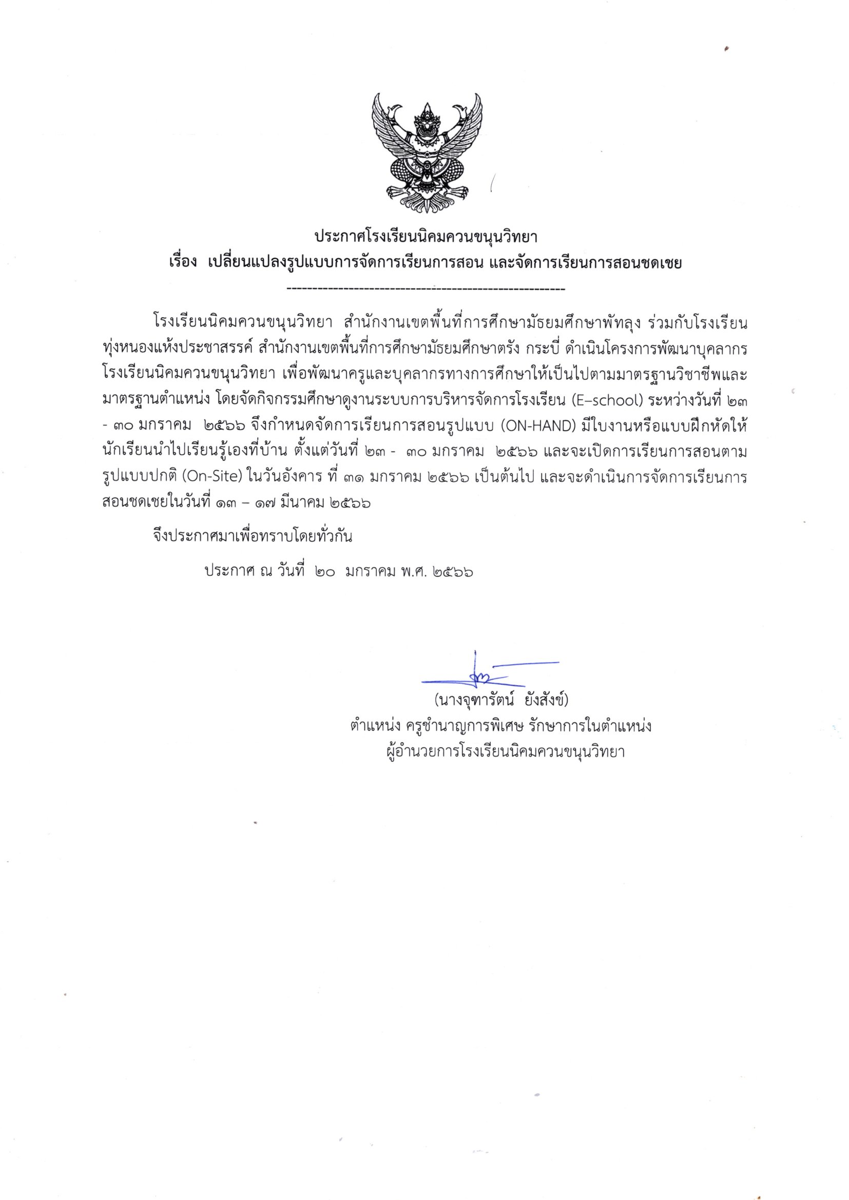 ประกาศโรงเรียนนิคมควนขนุนวิทยา เรื่อง เปลี่ยนแปลงการจัดการเรียนการสอน และจัดการเรียนการสอนชดเชย