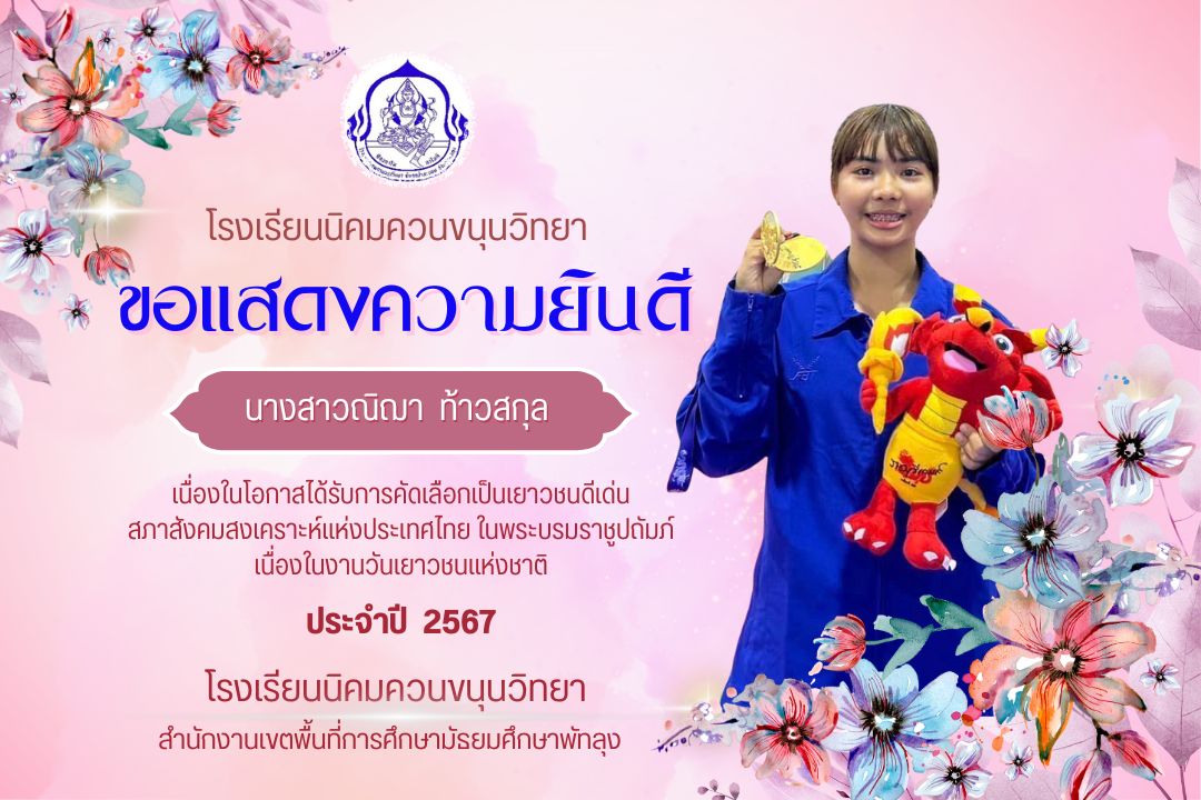 เป็นเยาวชนดีเด่น สภาสังคมสงเคราะห์แห่งประเทศไทย ในพระบรมราชูปถัมภ์ ทางโรงเรียนนิคมควนขนุนวิทยา