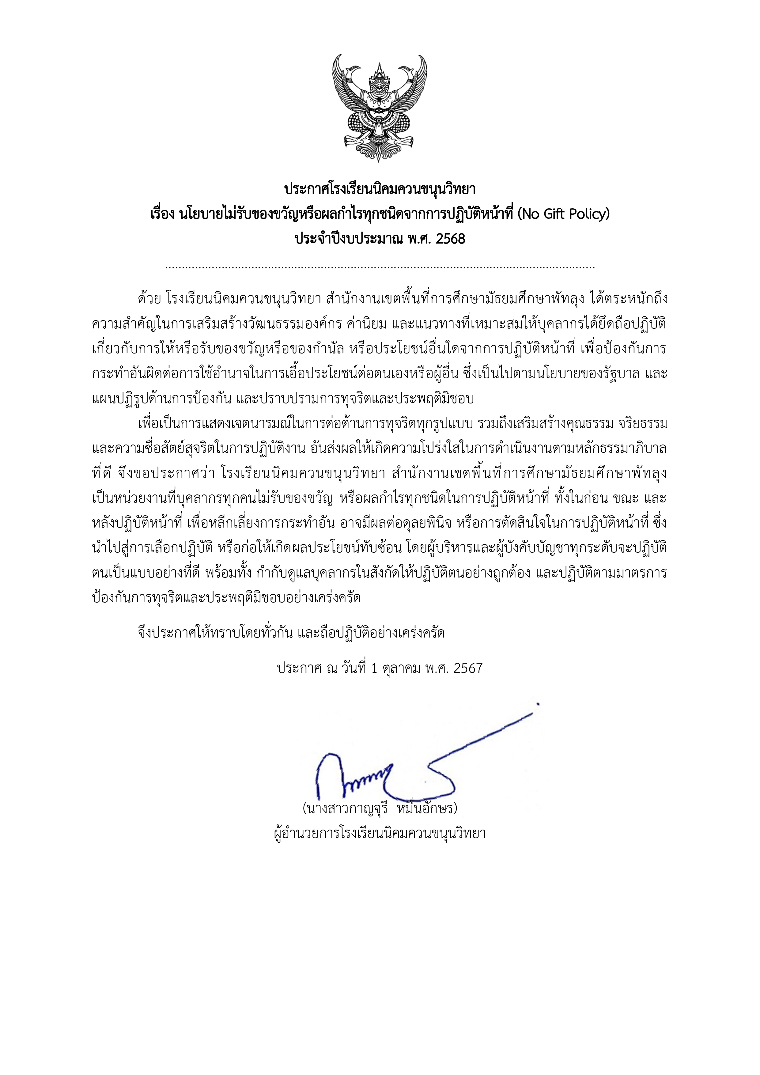 ประกาศโรงเรียนนิคมควนขนุนวิทยา เรื่อง นโยบายไม่รับของขวัญหรือผลกําไรทุกชนิดจากการปฏิบัติหน้าที่ (No Gift Policy) ประจำปีงบประมาณ พ.ศ. 2568