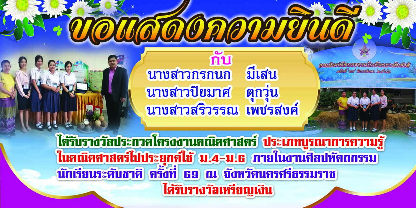 นางสาวกรกนก มีเสน ,นางสาวปิยมาศ ตุกวุ่น,นางสาวสริวรรณ เพชรสงค์ นักเรียนชั้น ม.6/1ได้รับรางวัลเหรียญเงินการประกวดโครงงานคณิตศาสตร์ ประเภทบูรณาการความรู้ในคณิตศาสตร์ไปประยุกต์ใช้ ม.4-ม.6 งานศิลปหัตกรรมนักเรียนระดับชาติ ครั้งที่ 69 ณ จังหวัดนครศรีธรรมราช