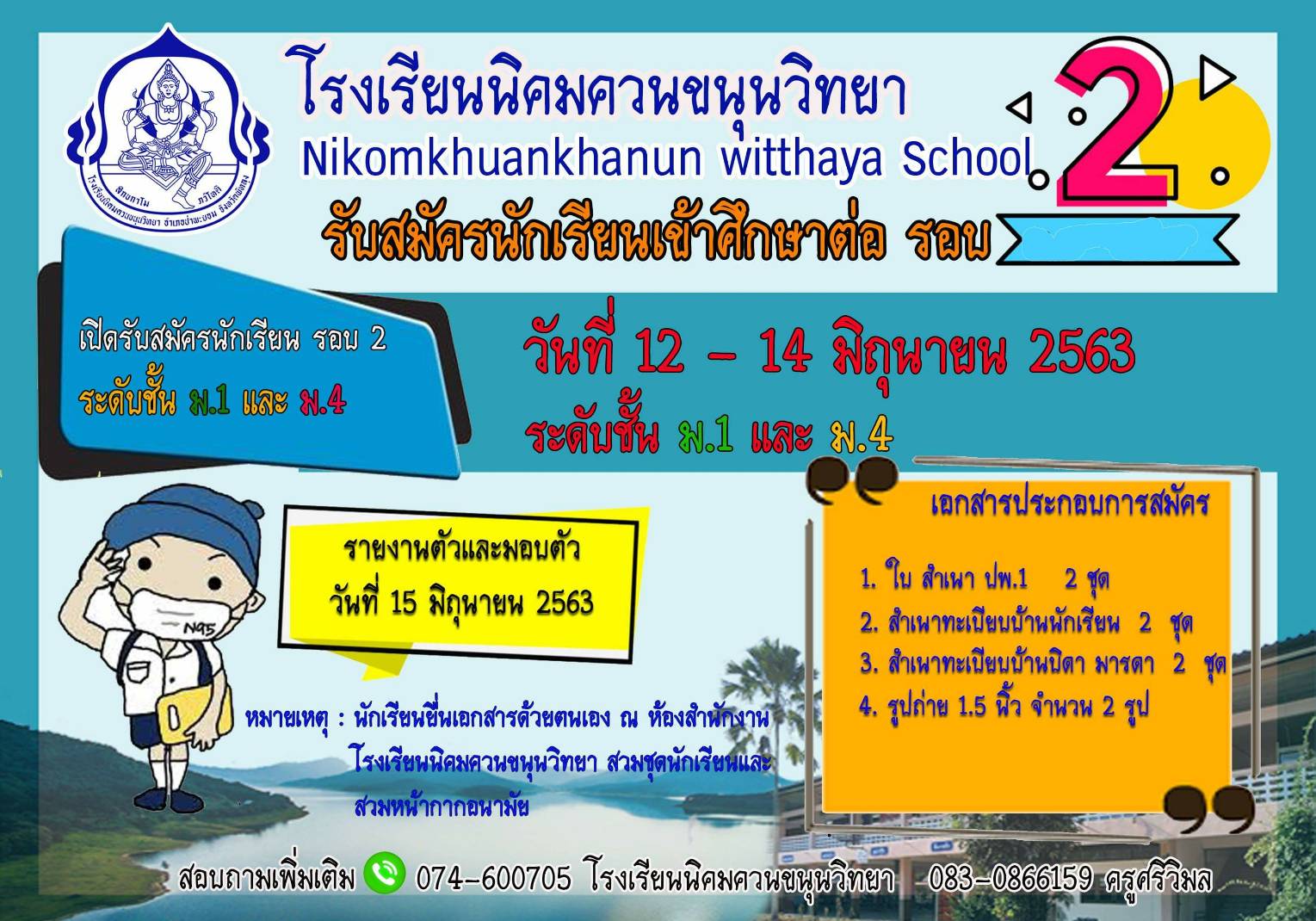 โรงเรียนนิคมควนขนุนวิทยา รับสมัครนักเรียนชั้น ม.1และ ม.4 เข้าศึกษาต่อ รอบ 2 ประจำปีการศึกษา 2563 วันที่ 12-14 มิถุนายน 2563