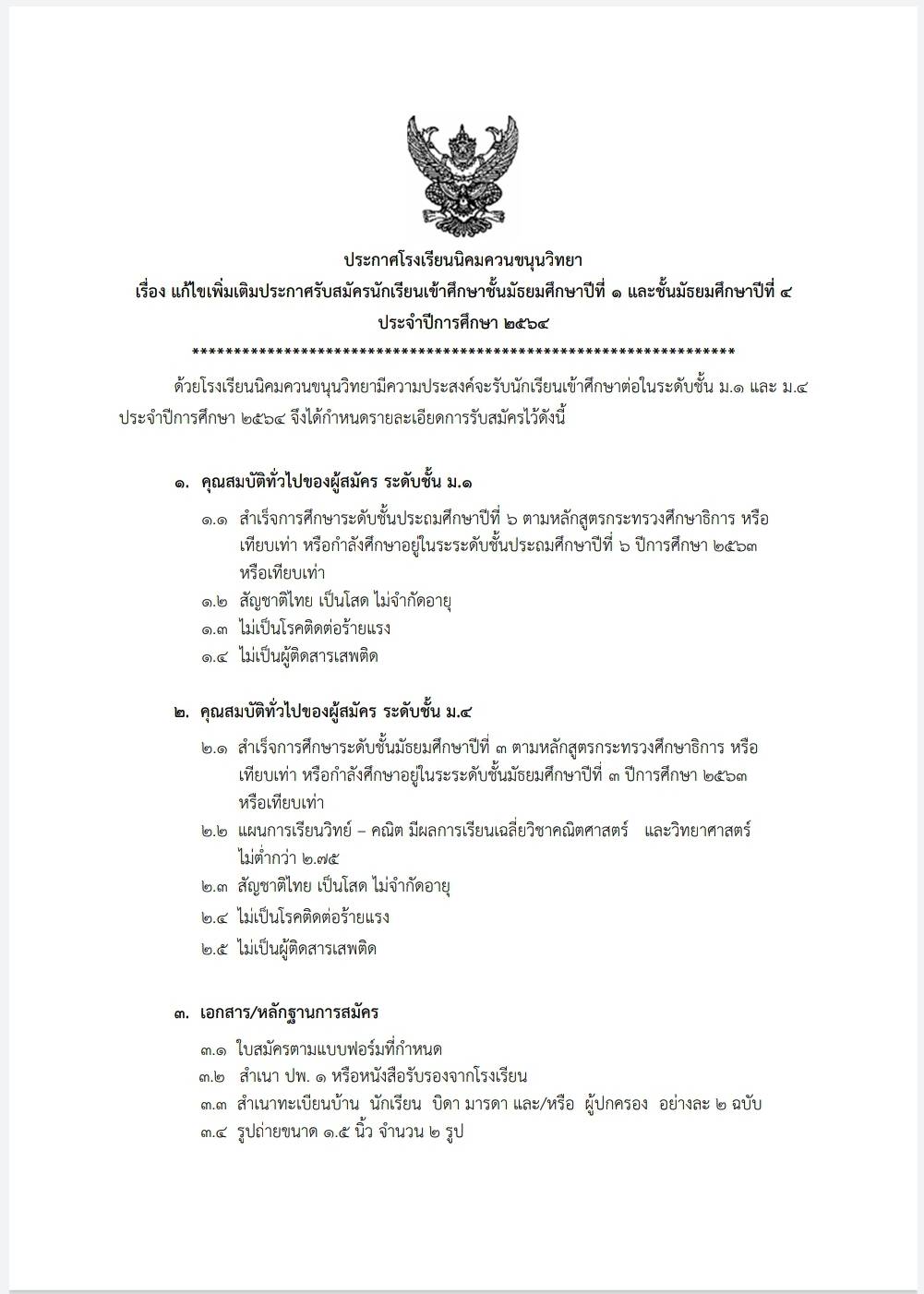ประกาศรับสมัครนักเรียนชั้น ม.1 และ ม.4 ประจำปีการศึกษา 2564( แก้ไขเพิ่มเติม)