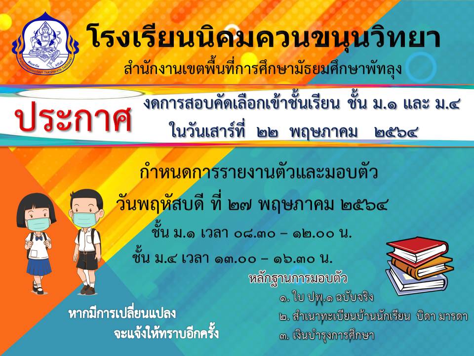 ประกาศ งดการสอบคัดเลือกเข้าเรียนชั้น ม.1 และ ม.4 ในวันเสาร์ที่ 22 พฤษภาคม 2564