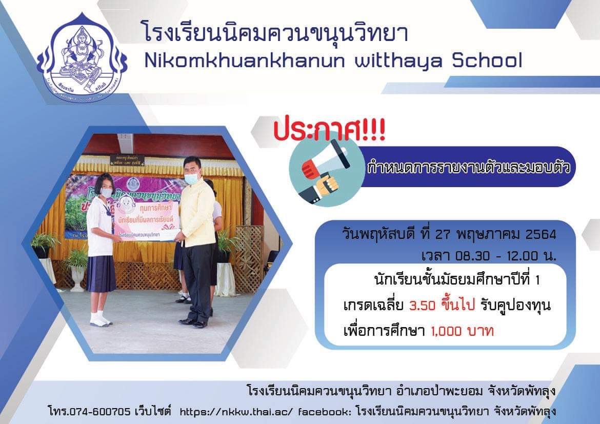 ประกาศ วันรายงานตัวและมอบตัว นักเรียนชั้น ม.1 เกรดเฉลี่ย 3.50 ขึ้นไป รับคูปองทุนเพื่อการศึกษา 1,000 บาท