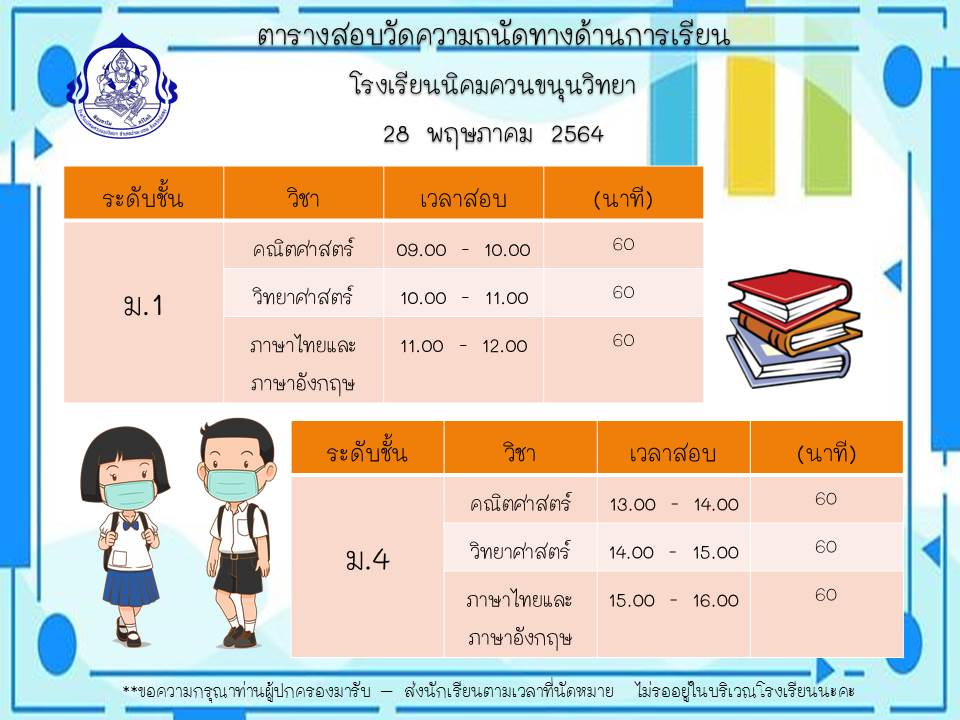 ตารางวัดความถนัดทางการเรียน นักเรียนชั้น ม.1 และ ม.4 โรงเรียนนิคมควนขนุนวิทยา วันที่ 28 พฤษภาคม 2564