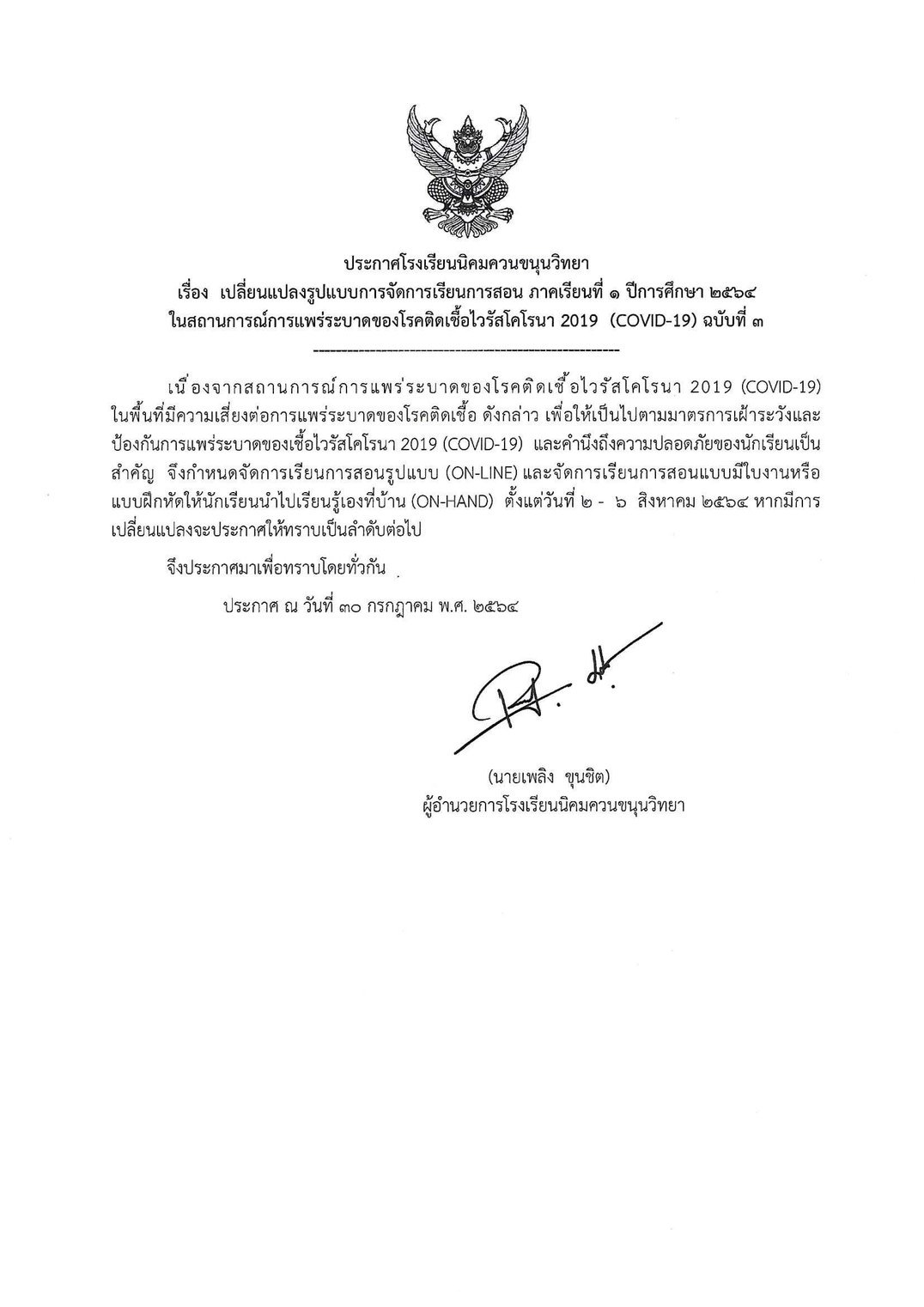 ประกาศโรงเรียนนิคมควนขนุนวิทยา เรื่อง เปลี่ยนแปลงรูปแบบการจัดการเรียนการสอน เป็นรูปแบบออนไลน์(ON-LINE)และจัดการเรียนการสอนแบบมีใบงานหรือแบบฝึกหัดให้นักเรียนไปเรียนรู้เองที่บ้าน (ON-HAND)ตั้งแต่วันที่