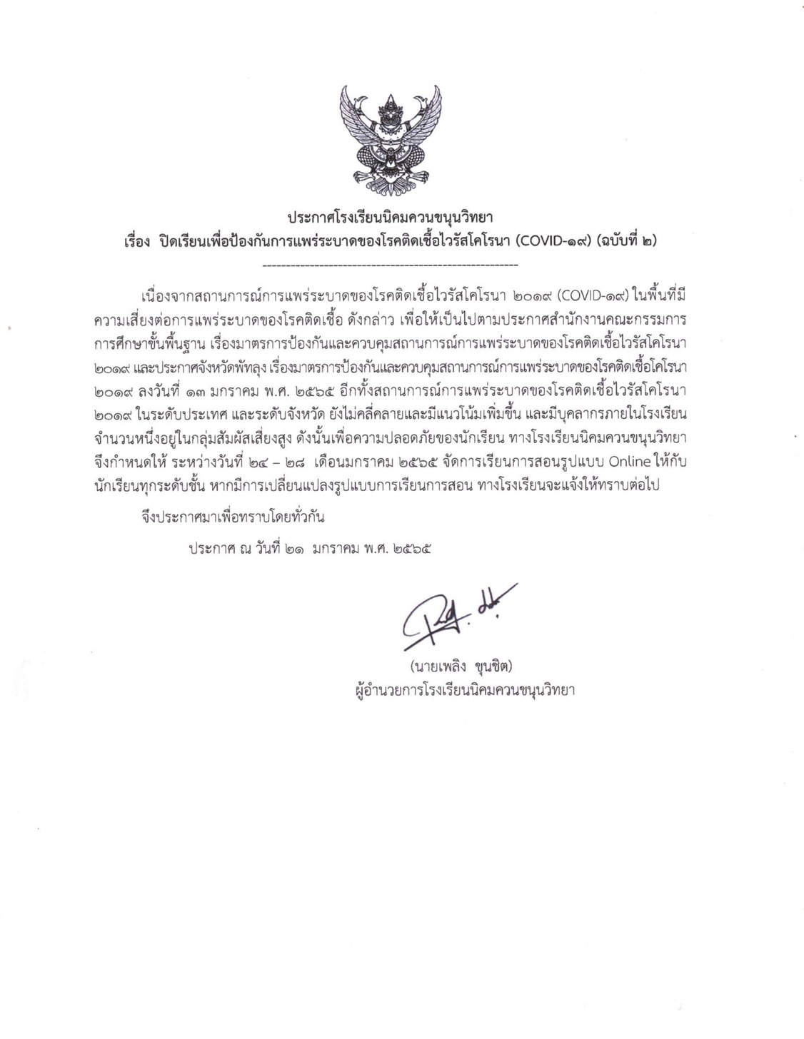 ประกาศโรงเรียนนิคมควนขนุนวิทยา เรื่อง ปิดเรียนเพื่อป้องกันการแพร่ระบาดของโรคติดเชื้อไวรัสโคโรนา2019 (COVID-19)(ฉบับที่2)